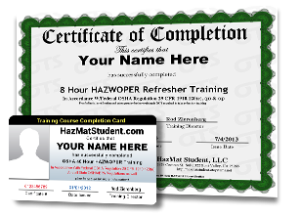 Una vez completado el curso, usted será inmediatamente será capaz de descargar, guardar o imprimir su certificado del curso que se proporciona en formato PDF. También ofrecemos la opción de enviar por correo una tarjeta de identificación de la carpeta del estilo de tarjeta de crédito de PVC, con la foto opcional, que muestra la finalización del curso de formación. Si se selecciona durante la inscripción, esta opción tarjeta de identificación tiene un costo adicional de $5.00, y la tarjeta será enviado dentro de las 24 horas de la finalización del curso.