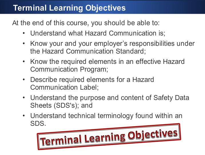 The objective of this HAZCOM GHS aligned training course is to help employers meet OSHA’s 2012 HAZCOM Standard, aligned with the Globally Harmonized System of Classification and Labeling of Chemicals (GHS).