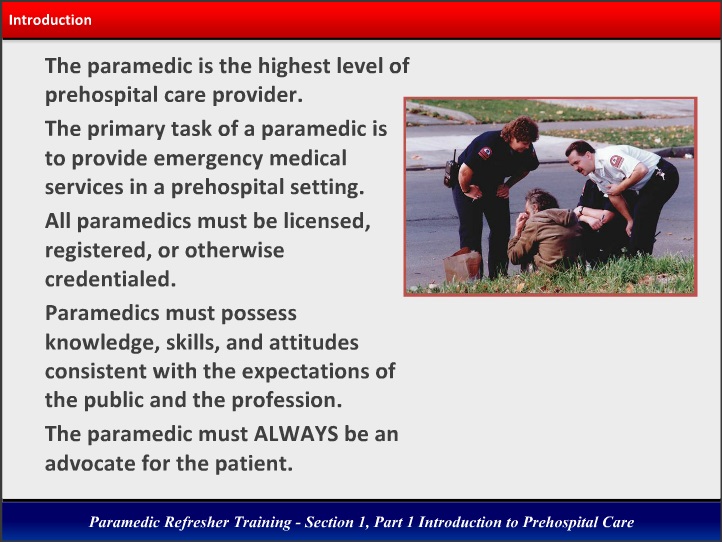California Paramedics require a current, valid Healthcare Provider CPR card. Please check with your EMS Authority to ensure all state and local paramedic recertification requirements are met. This online Paramedic course provides valuable paramedic recertification online training information, but it is not meant to replace hands-on training which is critical.