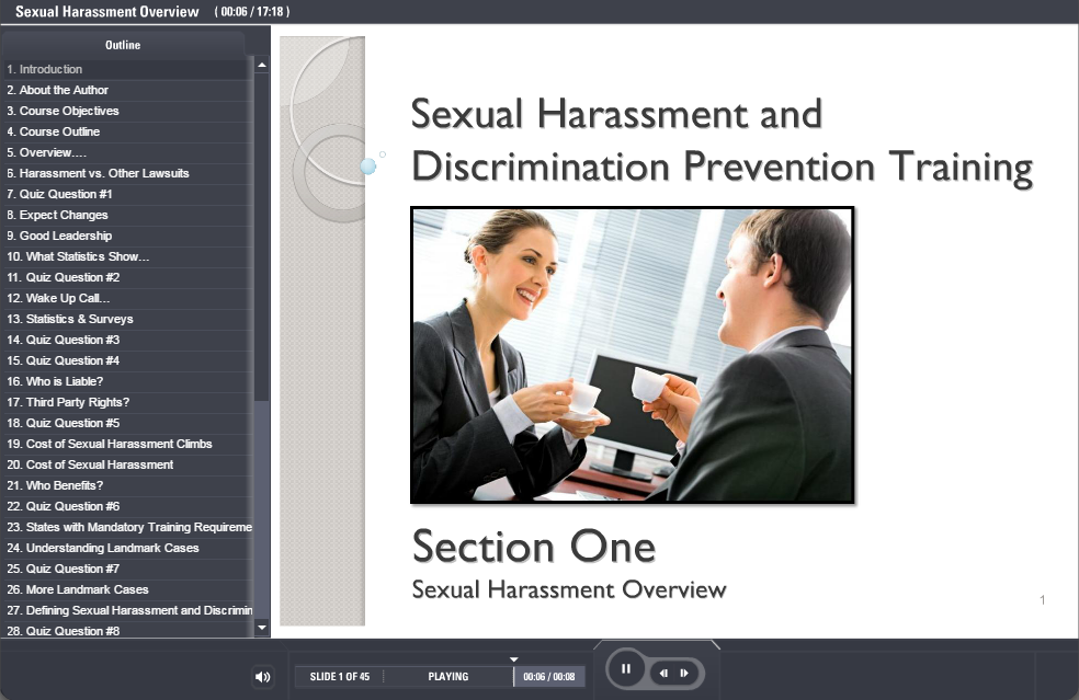 The course objective is to provide both employers and employees training regarding sexual discrimination and sexual harassment, and to assist in compliance with applicable State and Federal laws.